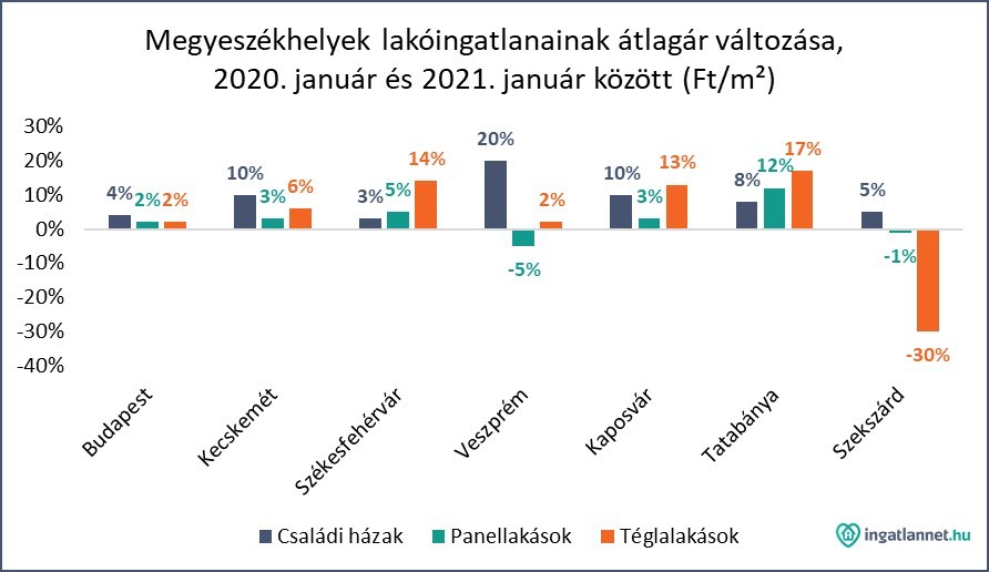 Az Ingatlannet.hu a környező megyeszékhelyek lakóingatlanainak átlagár változását is megvizsgálta. A legtöbb helyen, köztük Budapesten, Kecskeméten, Székesfehérváron, Kaposváron és Tatabányán csak áremelkedésnek lehettünk tanúi. Nem úgy, mint Veszprémben vagy Szekszárdon, ahol már szabad szemmel is jól láthatóan csökkentek az ingatlanárak. Veszprém esetében a panellakások lettek olcsóbbak 5%-kal, Szekszárd esetében pedig a téglalakások átlagárát vitték lejjebb összességében 30%-kal.