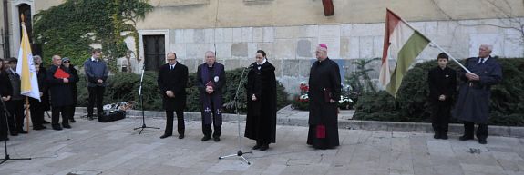 Szombaton reggel imádságos megemlékezést tartottak a Bazilika '56-os emlékkeresztjénél. A Nagy Benedek szobrászművész készítette feszülete alatt Kovács Péter Barnabás művészettörténész elevenítette fel az 56-os forradalom és szabadságharc történéseit saját élményei alapján. Az ünnepségen a történelmi egyházak imádsága után koszorút és virágokat helyeztek el az emlékműnél.