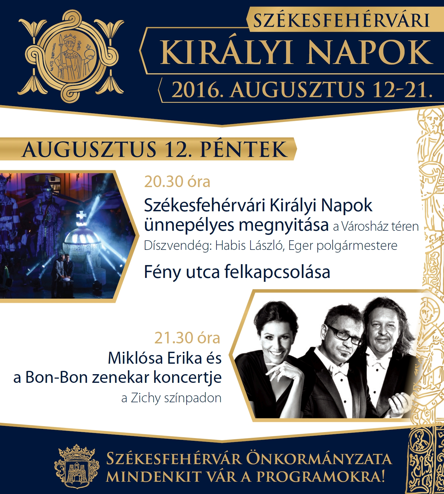 Impozáns megnyitó ünnepséggel kezdődik a Székesfehérvári Királyi Napok pénteken 20.30-kor: Beethoven István király nyitányára készült el az idei fényjáték, amely a Székesfehérvári Királyi Napok nyitóünnepségén lesz látható pénteken este a Városház téren. Falvay Miklós animációs alkotásában a magyar koronázási palást elevenedik meg és kínál felemelő élményt az ünnepség résztvevőinek, amelynek középpontja hagyományosan az Országalma lesz.