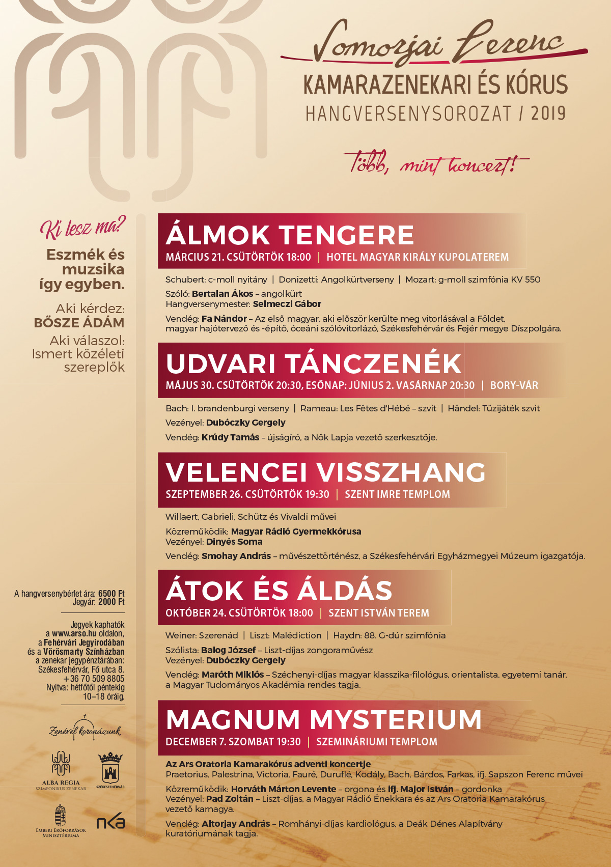 A Somorjai-bérlet záró estje Magnum Mysterium címmel, több évszázad egyházi kórusművészetét mutatja be a székesfehérvári zenebarátoknak december 7-én, 19.30 órától a Szemináriumi templomban. Praetorius, Palestrina, Victoria, Fauré, Duruflé, Kodály, Bach, Bárdos, Farkas Ferenc és ifj. Sapszon Ferenc műveit a város újonnan alakult kórusának, az ARS Oratoria Kamarakórusnak előadásában élvezhetjük. Az adventi hangverseny dirigense Pad Zoltán Liszt-díjas karvezető, a Magyar Rádió Énekkara vezető karnagya lesz. Orgonán közreműködik Horváth Márton Levente Erkel-díjas orgonaművész, gordonkán pedig ifj. Major István, az Alba Regia Szimfonikus Zenekar igazgatója. Az est vendége Székesfehérvár köztiszteletben álló szívgyógyásza, dr. Altorjay András Romhányi-díjas kardiológus, a Deák Dénes Alapítvány kuratóriumának tagja lesz.