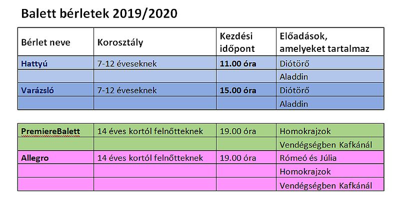 Újdonság, hogy az előadásokat bérletes formában is megnézheti majd a közönség. A balettszínház négy bérletet hirdet meg, két korcsoportban: a 7–12 éveseknek szóló Hattyú és Varázsló bérletekben a Diótörő című családi balettet és az Aladdin című mesebalettet játsszák majd, a 14 éves kortól, felnőtteknek ajánlott Premiere Balett és Allegro bérletekben a Homokrajzok című kétfelvonásos táncest, a Vendégségben Kafkánál című táncos videóklip és a Rómeó és Júlia című táncdráma kapott helyet.
