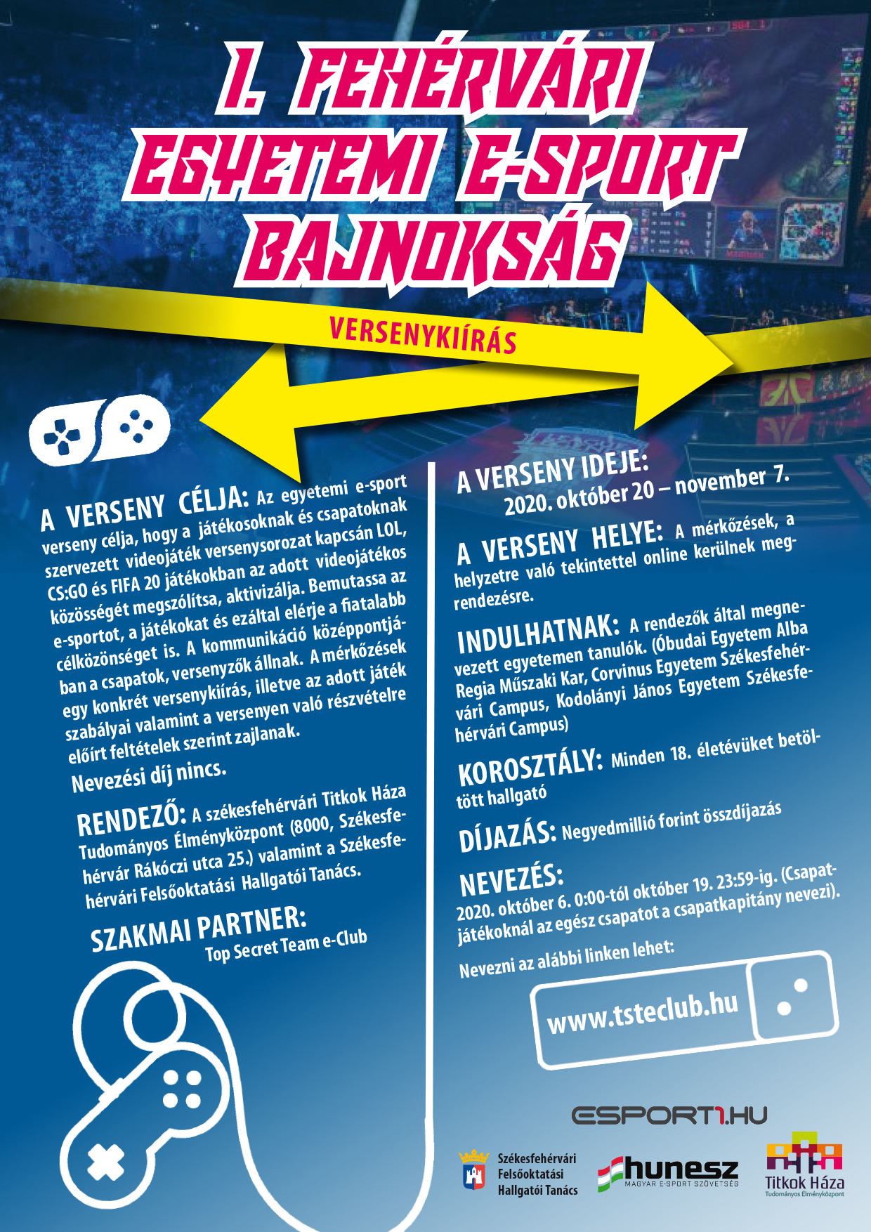 Az I. Fehérvári Egyetemi E-sport Bajnokságra az Óbudai Egyetem, a Corvinus Egyetem és a Kodolányi János Egyetem 18. életévét betöltött hallgatói nevezhetnek 2020. október 19. éjfélig a www.tsteclub.hu oldalon. Csapatjátékoknál az egész csapatot a csapatkapitány nevezi. Az összdíjazás negyedmillió forint. A bajnokság 2020. október 20-án indul, a döntőkre 2020. november 7-én kerül sor. A program megvalósításához szakmai segítséget nyújt a Hunesz (Magyar E-Sport Szövetség) továbbá az ESPORT1.hu.