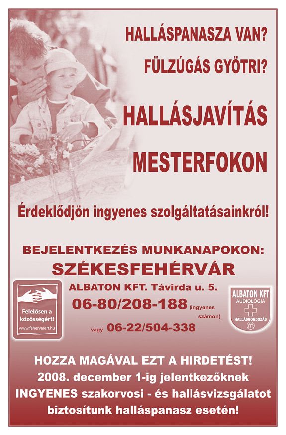 Székesfehérvár társadalmi felelősségvállalási programjához csatlakozott az Albatone hallásközpont is. December elsejéig ingyenes szakorvosi- és hallásvizsgálatot biztosítanak mindenkinek, aki úgy érzi probléma van hallásával. A Távirda utcai rendelőben szakorvosok vizsgálják a halláspanasszal jelentkezőket. Az ingyenes hallásvizsgálatra a 06-80/208-188-as telefonszámon lehet bejelentkezni.