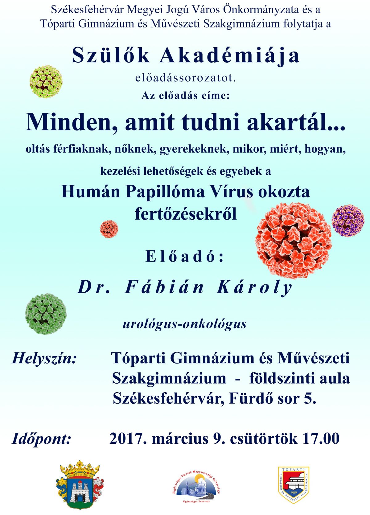 A Szülők Akadémiája programsorozat március 9-i előadása a Humán Papillóma Vírus okozta fertőzésekről fog szólni, Dr. Fábián Károly urológus-onkológus előadásában. Ennek során a résztvevők választ kaphatnak számos kérdésre, többek között arra, hogy miért és kit érdemes, vagy fontos beoltani, milyen elváltozásokat okozhat a HPV a férfiaknál és milyet a nőknél, egyáltalán hogyan terjed a fertőzés, vannak-e különösen veszélyeztetett csoportok, korosztályok? Természetesen emellett arról is esik szó, hogy az oltásnak van-e kockázata?