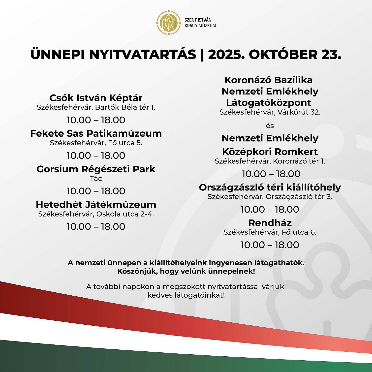 Ingyenes belépéssel várják az érdeklődőket október 23-án, hétfőn a Szent István Király Múzeum nyitva tartó kiállítóhelyein. Díjmentesen lesz látogatható a Nemzeti Emlékhely, a Rendház, az Országzászló téri kiállítóhely, a Csók István Képtár, a Koronázó Bazilika Látogatóközpont, a Hetedhét Játékmúzeum és a Gorsium Régészeti Park is.