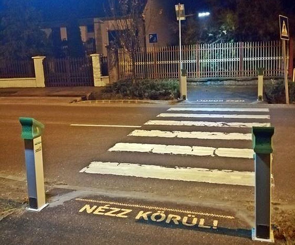 A zebra négy sarkán van egy oszlopunk, ezekből vetítünk szembe egy-egy vonallézert, ezáltal a zebra felett egy láthatatlan fénysáv alakul ki – ahogy egy gyalogos belelép ebbe a sávba, a lábán fény jelenik meg. A lépéseivel, a mozgásával így villogó hatást lehet elérni, amit még külön villogtatással is lehet fokozni. A rendszer az éjszakai órákban működik, amikor gyalogost érzékel. Eleve van egy figyelemfelhívó sárga villogó a rendszerünkön, a plusz lézer fényhatás segítségével pedig azt is láthatjuk, hol tart éppen a gyalogos a zebrán: az esős, szürkületi, éjszakai időszakban, amikor a fények szanaszét szóródnak, kiegészítő lokalizációt ad.