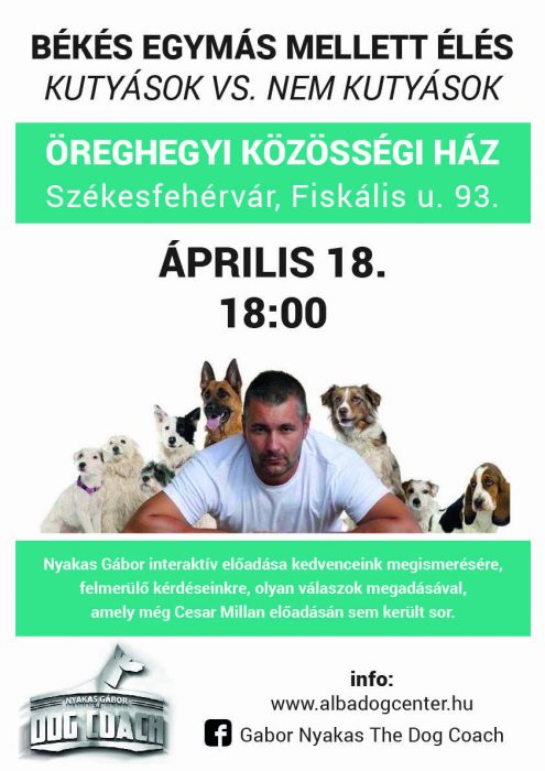 Öreghegy Székesfehérvár egyik igen sűrűn lakott, családi házas övezete, ahol nagyon sokan tartanak kutyát. A békés egymás mellett élés, egymás kölcsönös tiszteletben tartása, a konfliktusok és az esetleges támadások elkerülése érdekében egyedülálló, interaktív tréning indul az Öreghegyi Közösségi Házban, ahova várják a kutyatulajdonosokat, a nem kutyásokat, a kutyáktól félőket és az őket nem szeretőket egyaránt. Az első alkalomra április 18-án, kedden 18.00 órai kezdettel kerül sor.