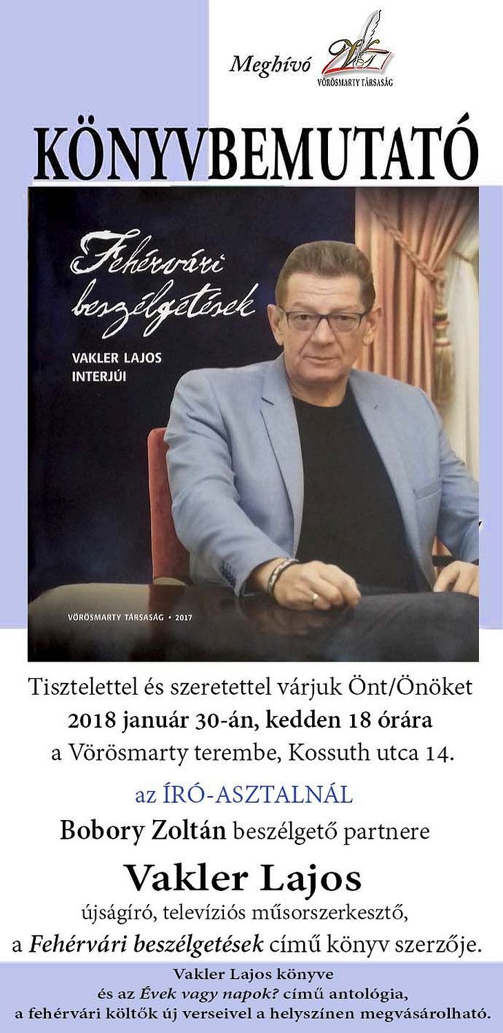 A Fehérvári beszélgetések bemutatója január 30-án, kedden a Vörösmarty Társaság termében lesz 18 órakor. A szerzővel Bobory Zoltán író, a Társaság elnöke beszélget. A rendezvény ingyenes, mindenkit szeretettel várnak!
