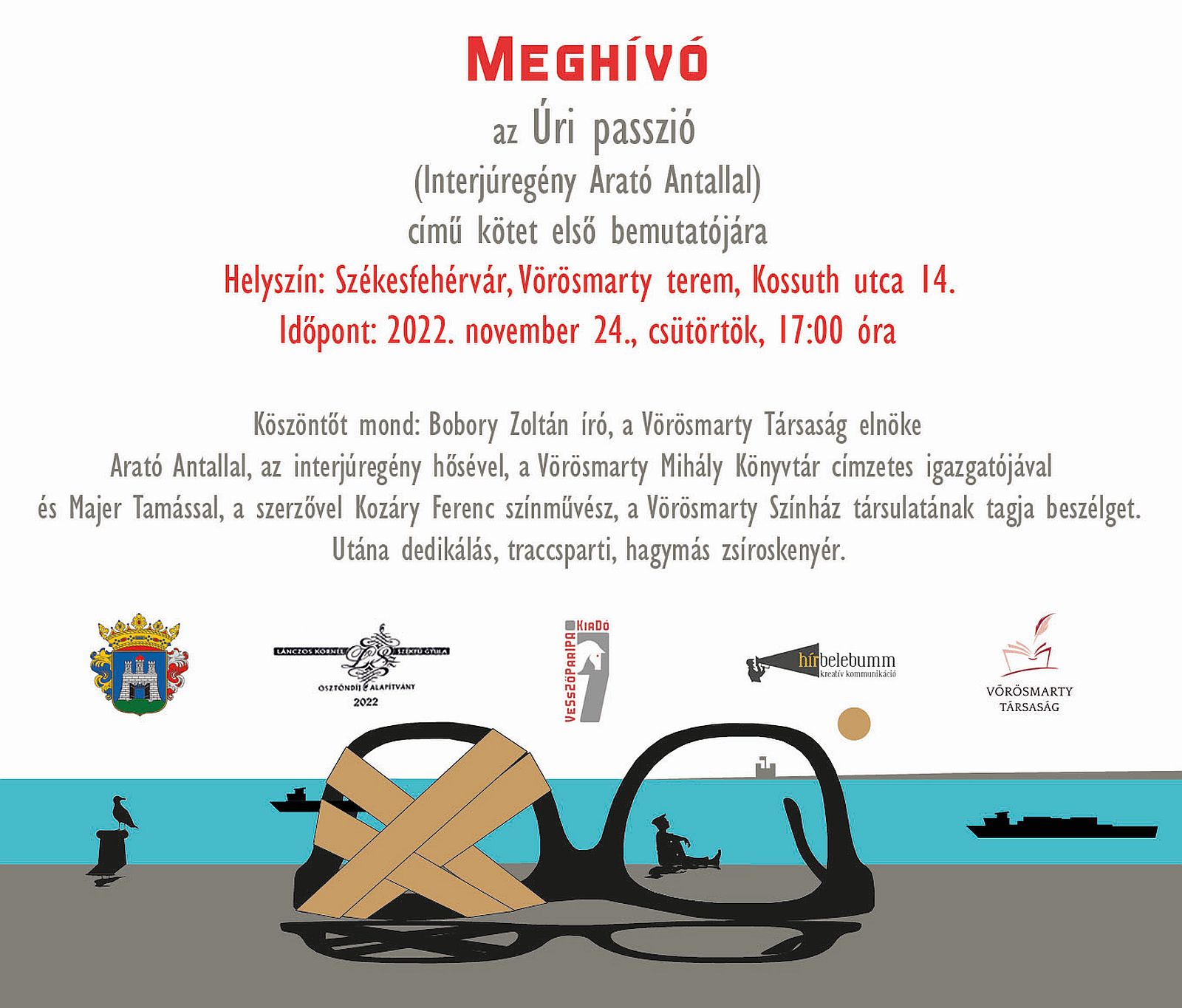Az interjúregény első bemutatóját 2022. november 24-én, csütörtökön, 17 órai kezdettel tartja meg a Vesszőparipa Kiadó és a Vörösmarty Társaság Székesfehérváron, a Kossuth utca 14. szám alatti Vörösmarty teremben. Köszöntőt mond Bobory Zoltán író, a Vörösmarty Társaság elnöke. Arató Antallal és Majer Tamással Kozáry Ferenc színművész, a Vörösmarty Színház társulatának tagja beszélget. Utána dedikálás, traccsparti, hagymás zsíros kenyér várja a résztvevőket.