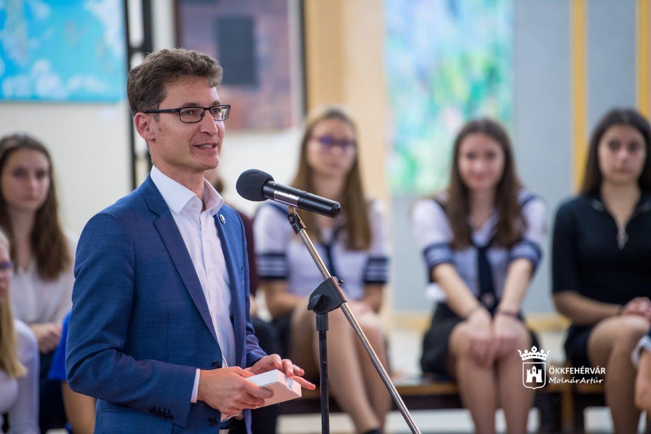 Az igazgató a város és azon belül a gimnázium diákságáért végzett munkájáért köszönetképpen a Tehetséges Tópartis Tanulók Alapítványának elismerő plakettjét adta át a polgámesternek, és sok sikert kívánt a következő évek városvezetői feladataihoz.