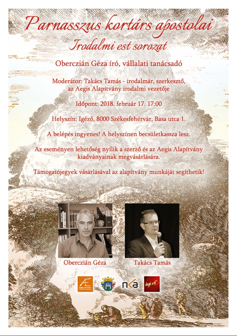 Az Aegis Művészetért és Kultúráért Alapítvány február 17-én, 17 órakor a Parnasszus kortárs apostolai irodalmi est sorozat következő állomását szervezi meg az Székesfehérváron az Igézőben. Az eseményt támogatja a Nemzeti Kulturális Alap, Székesfehérvár Önkormányzata és a Barankovics Alapítvány is.