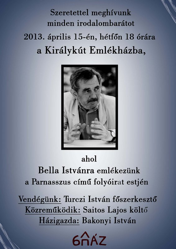 Április 15-én, hétfőn a Királykút Emlékházban a Parnasszus folyóirat estjének keretén belül Bella Istvánra emlékeznek. A vendégek Turczi István főszerkesztő és Saitos Lajos költő. A 18 órakor kezdődő program házigazdája Bakonyi István irodalom történész lesz. A szervezők mindenkit szeretettel várnak.