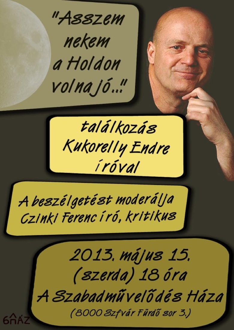 „Asszem nekem a holdon volna jó” címmel rendeznek irodalmi estet A Szabadművelődés Házában május 15-én 18 órakor. Az érdeklődők Kukorelly Endre József Attila-díjas magyar íróval, költővel találkozhatnak, aki irodalmi munkássága mellett a Kalligram című folyóirat rovatvezetője és a kreatív írás tanára. A beszélgetést Czinki Ferenc író, kritikus moderálja.