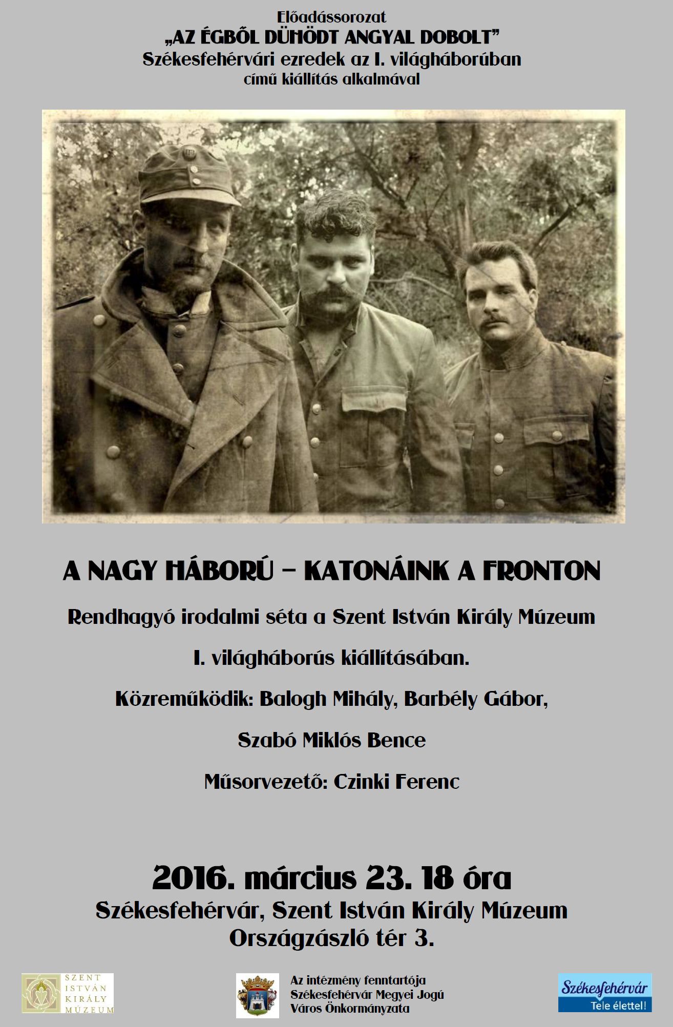 Március 23-án szerdán 18 órakor rendhagyó irodalmi a sétát tartanak a Szent István Király Múzeum I. világháborús kiállításához kapcsolódóan. "Az égből dühödt angyal dobolt" című tárlat irodalmi népszerűsítésében Balogh Mihály, Barbély Gábor és Szabó Miklós Bence működik közre, a műsorvezető Czinki Ferenc lesz.