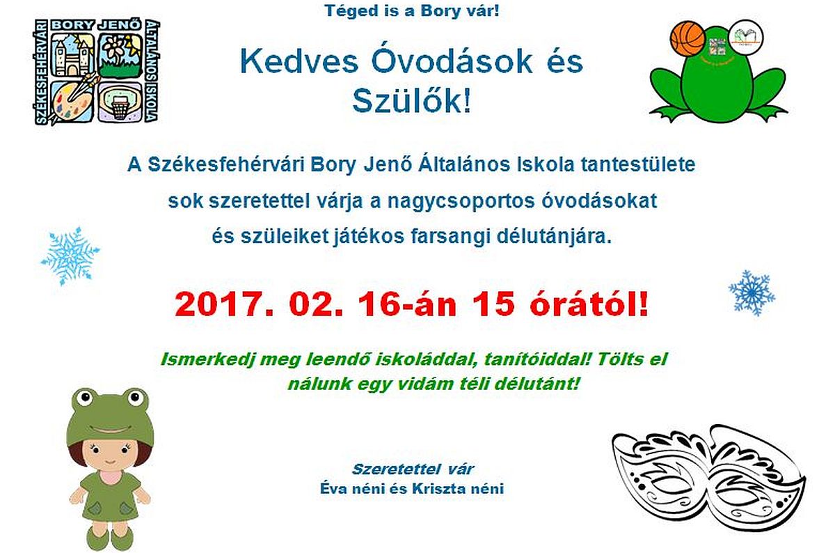 Két oktatási intézményben is szerveznek iskolába hívogató programot a nagycsoportos óvodások és szüleik számára 2017. február 16-án, csütörtökön délután.A Székesfehérvári Bory Jenő Általános Iskolában 15.00 órakor játékos farsangi mulatság kezdődik. A program keretében a gyerekek és szüleik megismerkedhetnek a leendő elsős tanító nénikkel.