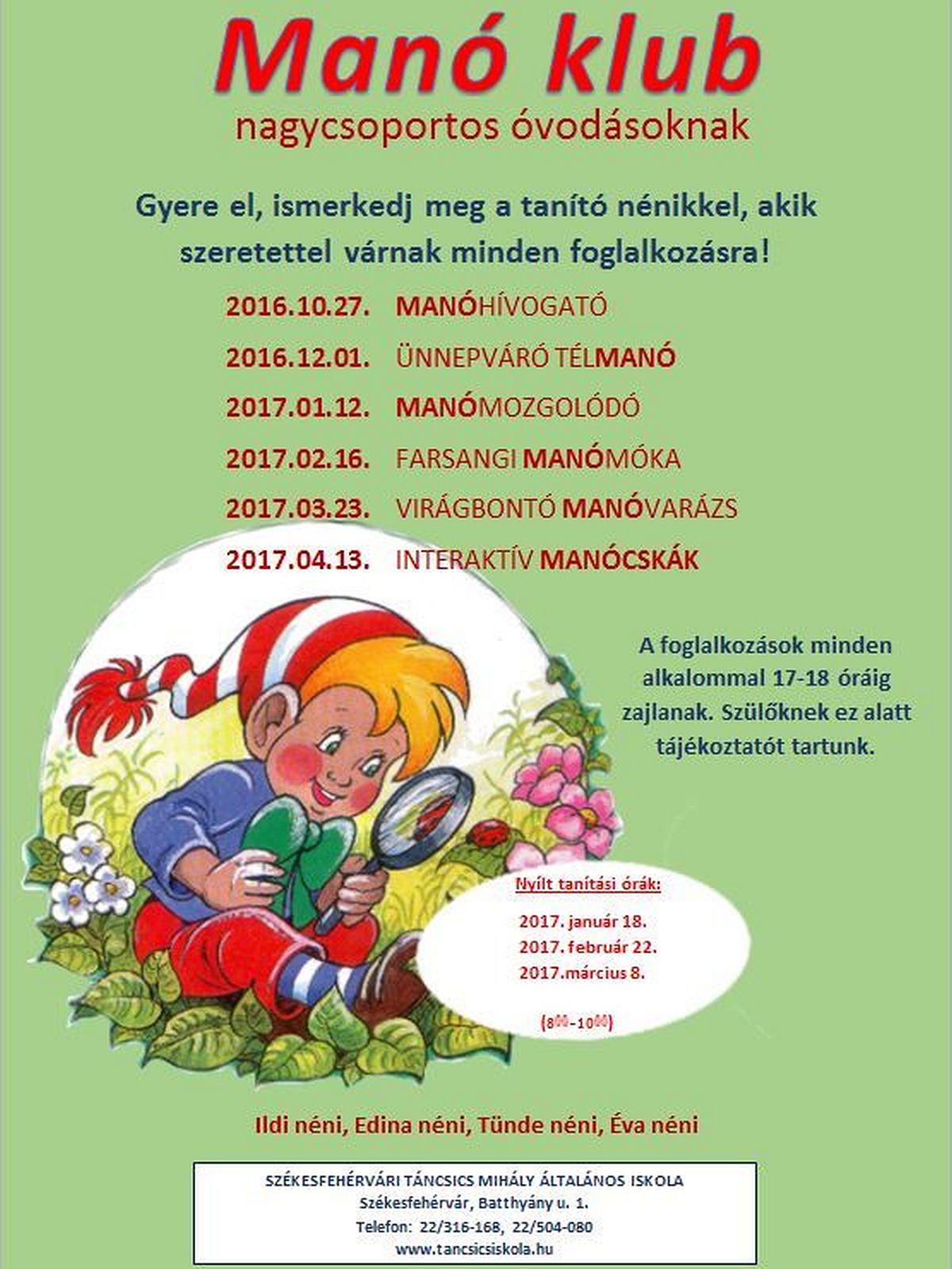 A Székesfehérvári Táncsics Mihály Általános Iskolában 17.00 órától folytatódik a Manó Klub programsorozata. Miközben a gyerekek a Farsangi Manómókában töltik az időt, a szüleik számára tájékoztatót tartanak az intézményben folyó munkáról.