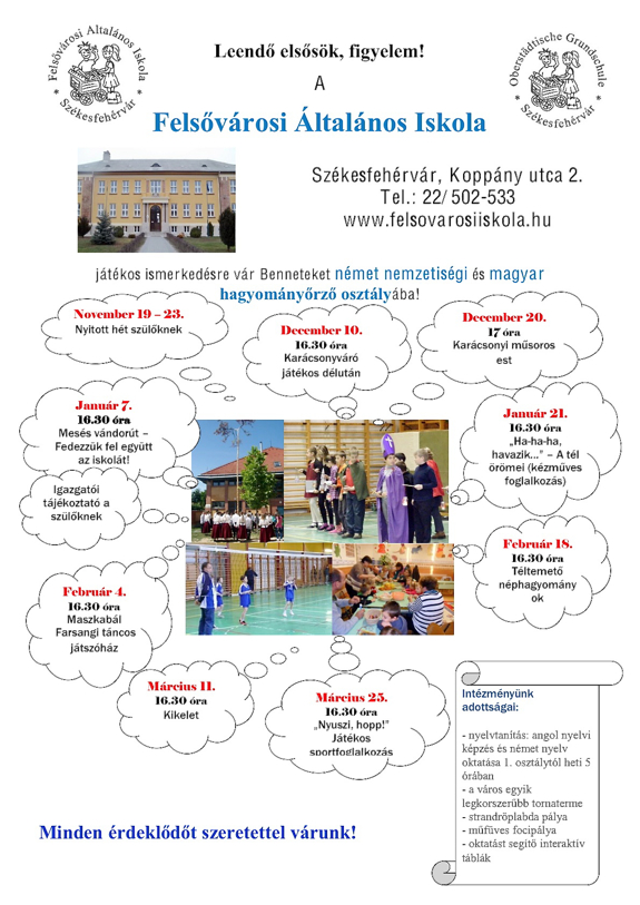 Január 21-én 16.30 órakor „Ha-ha-ha, havazik…” – A tél örömei címmel iskolába hívogató foglalkozásra várják a leendő elsős tanító nénik a nagycsoportos óvodásokat a Felsővárosi Általános Iskola német nemzetiségi és hagyományőrző osztályába. Az intézmény leendő tanulói angol nyelvi képzést és német nyelv oktatásat kapnak 1. osztálytól heti 5 órában és a város egyik legkorszerűbb tornatermében sportolhatnak.