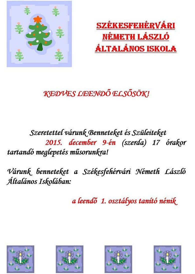 Folytatódik az iskolába hívogató programsorozat a Székes- fehérvári Németh László Általános Iskolában. 2015. december 9-én, szerda délután meglepetés műsorral készülnek a szervezők. Az ünnepi összeállításra sok szeretettel várják a nagycsoportos óvodásokat és szüleiket. Az esemény szerda délután 17.00 órakor kezdődik.