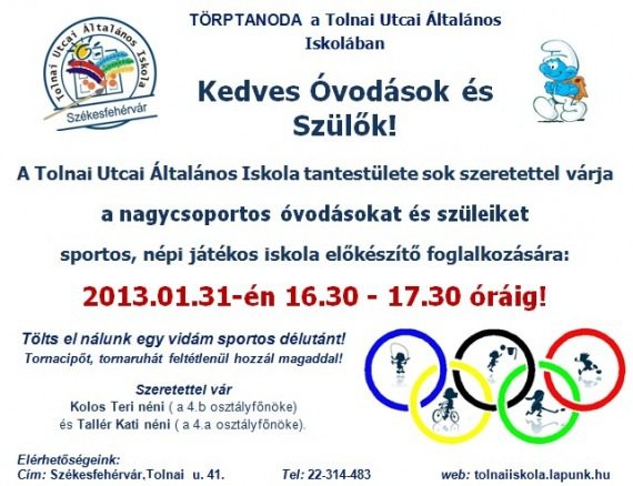 A Tolnai Utcai Általános Iskola tantestülete sok szeretettel várja a nagycsoportos óvodásokat és szüleiket iskolaelőkészítő foglalkozására január 31-én 16.30 órától. A foglalkozás keretében különböző sportokat és népi játékokat próbálhatnak ki a gyerekek és megismerkedhetnek leendő tanítóikkal is. A vidám sportos délután iránt érdeklődő leendő elsősöket arra kérik, hogy tornacipőt és tornaruhát hozzanak magukkal.