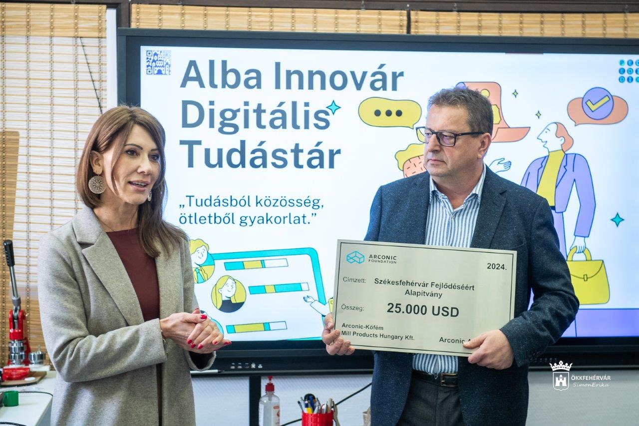 A támogatásról szóló – a vállalat fehérvári üzemében készült – alumíniumtáblát Varga Zsuzsanna, az Arconic – Köfém Mill Products Hungary Kft. HR vezetője, ügyvezetője adta át: „Piacvezető globális cégként elkötelezettek vagyunk a fenntartható értékteremtés mellett munkavállalóink, vevőink és a közösségünk felé. Az Arconic Alapítvány a nonprofit szervezetekkel együttműködve fejleszti a STEM (Science, Technology, Engineering, Math) oktatási programokat, elősegítve az egyéni és csoport szintű fejlődést az ipari szektorban, előmozdítva a környezeti fenntarthatóságot és az egyedi közösségi igényeket egyaránt.” – fogalmazott az ügyvezető, aki kiemelte, hogy az elmúlt négy évben közel 150.000 dollár adománnyal támogatták a Székesfehérvár Fejlődésért Alapítványon keresztül a fehérvári fiatalok versenyképes digitális ismereteinek fejlesztését. Varga Zsuzsanna hozzátette, a legnagyobb értéknek a gyermekeket tekinti, az Alba Innovár példája jól mutatja, miként lehet számukra élményszerűvé tenni az oktatást, függetlenül attól, hogy milyen képességű, esetleg speciális nevelési igényű gyermekről van szó.