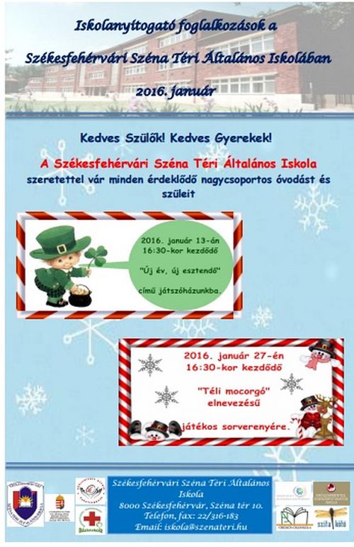 A Széna Téri Általános Iskola iskolanyitogató foglalkozásokat tart január 13-án és január 27-én 16.30 órakor. Január 13-án az Új év új esztendő című játszóházba várják a gyerekeket , január 27-én pedig a Téli mocorgó elnevezésű játékos sorversenyre kerül sor. Mindkét rendezvényre a nagycsoportos óvodásokat és szüleiket várják.