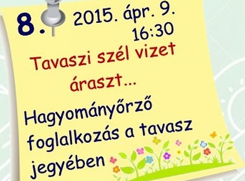 A Székesfehérvári Széna Téri Általános Iskola hagyományőrző foglalkozásra hívja az érdeklődő nagycsoportos óvodásokat 2015. április 9-én, csütörtökön. A 16:30-kor kezdődő „Tavaszi szél vizet áraszt…” című program keretén belül a gyerekek találkozhatnak a leendő elsős tanító nénikkel. Az eseményre sok szeretettel várnak minden érdeklődőt.