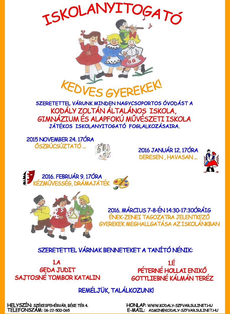 2015. november 24-én, kedden 17.00 órától játékos „Iskola- nyitogató” foglalkozásra várják a leendő első osztályosokat és szüleiket a Kodály Zoltán Általános Iskola, Gimnázium és Alapfokú Művészeti Iskolában (Székesfehérvár, Béke tér 4.). A jövő keddi eseményre sok szeretettel várnak minden érdeklődőt a tanító nénik.
