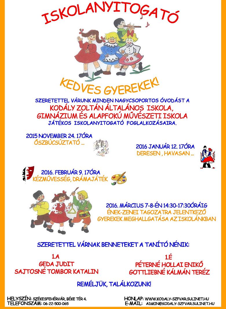 2016. január 12-én, kedden 17.00 órától játékos „Iskola- nyitogató” foglalkozásra várják a leendő első osztályosokat és szüleiket a Kodály Zoltán Általános Iskola, Gimnázium és Alapfokú Művészeti Iskolában (Székesfehérvár, Béke tér 4.). A jövő keddi eseményre sok szeretettel várnak minden érdeklődőt a tanító nénik.