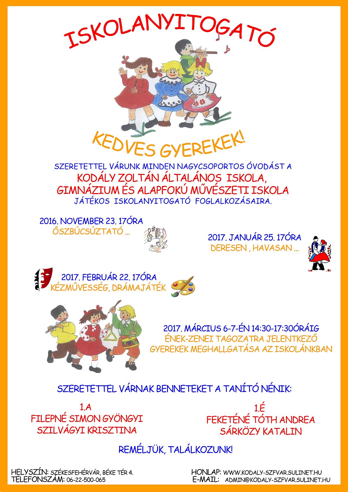 2016. november 23-án, kedden 17.00 órától játékos „Iskola- nyitogató” foglalkozásra várják a leendő első osztályosokat és szüleiket a Kodály Zoltán Általános Iskola, Gimnázium és Alapfokú Művészeti Iskolában (Székesfehérvár, Béke tér 4.). A szerdai eseményre sok szeretettel várnak minden érdeklődőt a tanító nénik!