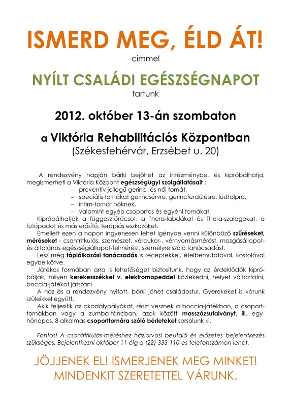 2012. október 13-án egészségnapot tart a Viktória Rehabilitációs Központ, melynek keretein belül az érdeklődők megismerhetik és kipróbálhatják az intézmény egészségügyi szolgáltatásait; különböző szűréseken, méréseken, táplálkozási és egyéb tanácsadásokon vehetnek részt, gyógy és szórakoztató mozgásformákat próbálhatnak ki, akár kerekesszékkel vagy elektromos mopeddel is.