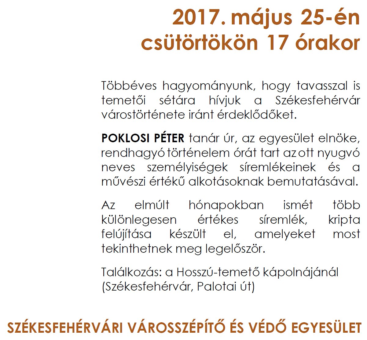 A Városszépítő- és Védő Egyesület május 25-én, csütörtökön 17 órakor rendhagyó történelemórára várja az érdeklődőket a Hosszú-temetőben. Poklosi Péter tanár úr, az egyesület elnöke az ott nyugvó neves személyiségek síremlékeivel és a temető művészi értékű alkotásaival ismerteti meg a résztvevőket. Az érdeklődőknek a Palotai úti Hosszú-temető kápolnájánál lesz a találkozó a programra.