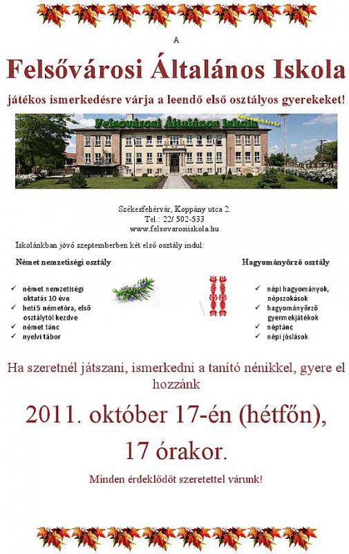 Játékos ismerkedésre várja leendő elsőseit a Felsővárosi Általános Iskola október 17-én hétfőn 17 órakor. Az intézmény német nemzetiségi és hagyományőrő osztályokat indít jövőre, az ide jelentkező kisiskolásokat várják a tanárok, hogy velük és leendő osztálytársaikkal már a tenévkezdés előtt megismerkedjenek, barátkozzanak.
