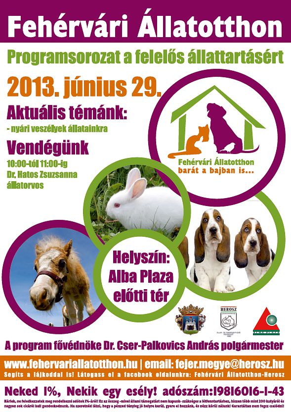 Újabb állomásaihoz érkezik a fehérvári Herosz hatrészes, tájékoztató és adománygyűjtő programsorozata, amelyet áprilisban indított a menhely Székesfehérvár Önkormányzata és az Alba Plaza támogatásával. Krepsz Gyöngyi, az állatotthon vezetője elmondta, június 29-én, szombaton 10 órától saját pavilonjukkal ismét kitelepülnek a bevásárlóközpont előtti térre.