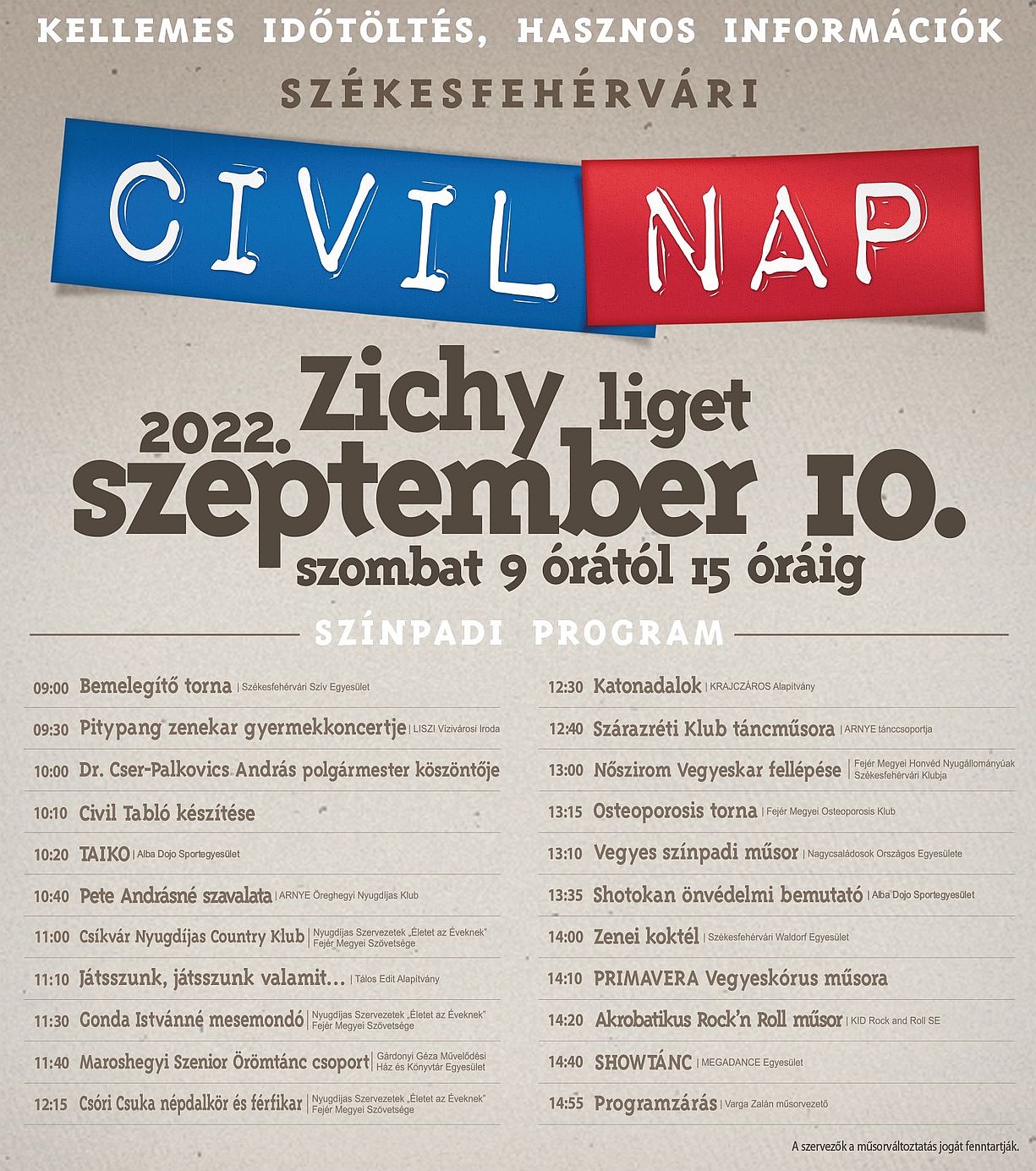 Mint arról Pisch Norbert, a nap programját összeállító ART Kulturális Egyesület elnöke beszámolt, a szervezetek interaktív, érzékenyítő, prevenciós és kézműves foglalkozásokkal, közös játékkészítéssel, hangszerbemutatóval, egészségközpontú, történelmi tematikájú, környezet- és természetvédelmi programokkal, harcművészeti bemutatóval, kisállat kiállítással, valamint kulturális előadásokkal és különleges sportbemutatókkal várják a látogatókat. Az idei Civil Napon összesen 63 szervezet mutatkozik be. A program 9 órakor egy közös bemelegítő tornával indul, majd a Pitypang zenekar koncertjével folytatódik. 10.00 órakor dr. Cser-Palkovics András polgármester köszönti a rendezvényen résztvevőket, majd a hagyomány szerint CIVIL TABLÓ készül a Civil Napon megjelenő szervezetek képviselőivel.