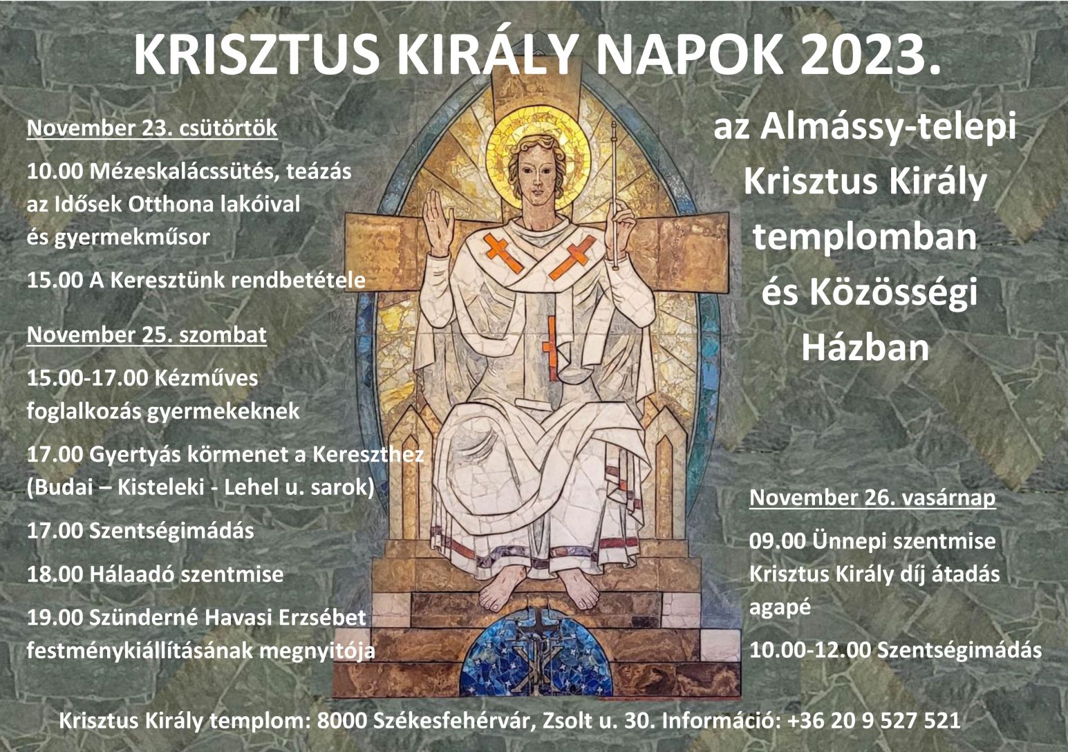 November 23-tól november 26-ig zajlanak az idei Krisztus Király Napok változatos programokkal. Az esemény vasárnap ünnepi szentmisével és a Krisztus Király díj átadásával zárul.