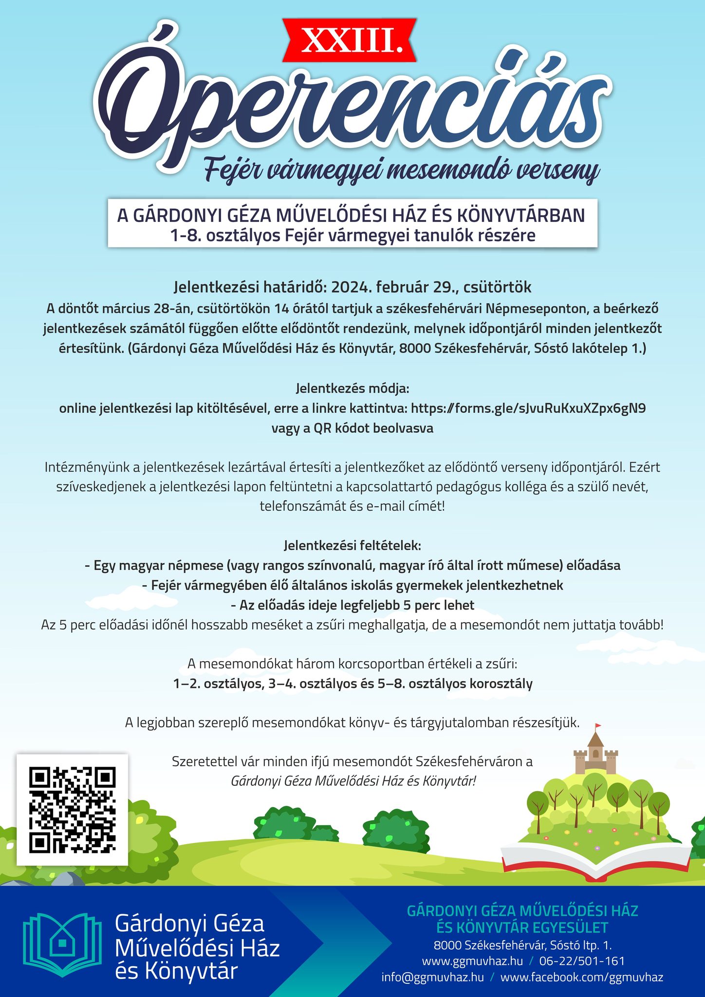 Jelentkezni ezúttal online lehet 2024. február 29-ig. A jelentkezési lap erre a linkre kattintva, vagy a felhíváson a QR kódot beolvasva érhető el. A döntőt március 28-án 14.00 órai kezdettel a székesfehérvári NépmesePonton, a Gárdonyi Géza Művelődési Házban tartják. Bővebb információ a 06-22/501-161-es telefonszámon vagy az info@ggmuvhaz.hu e-mail címen kérhető.