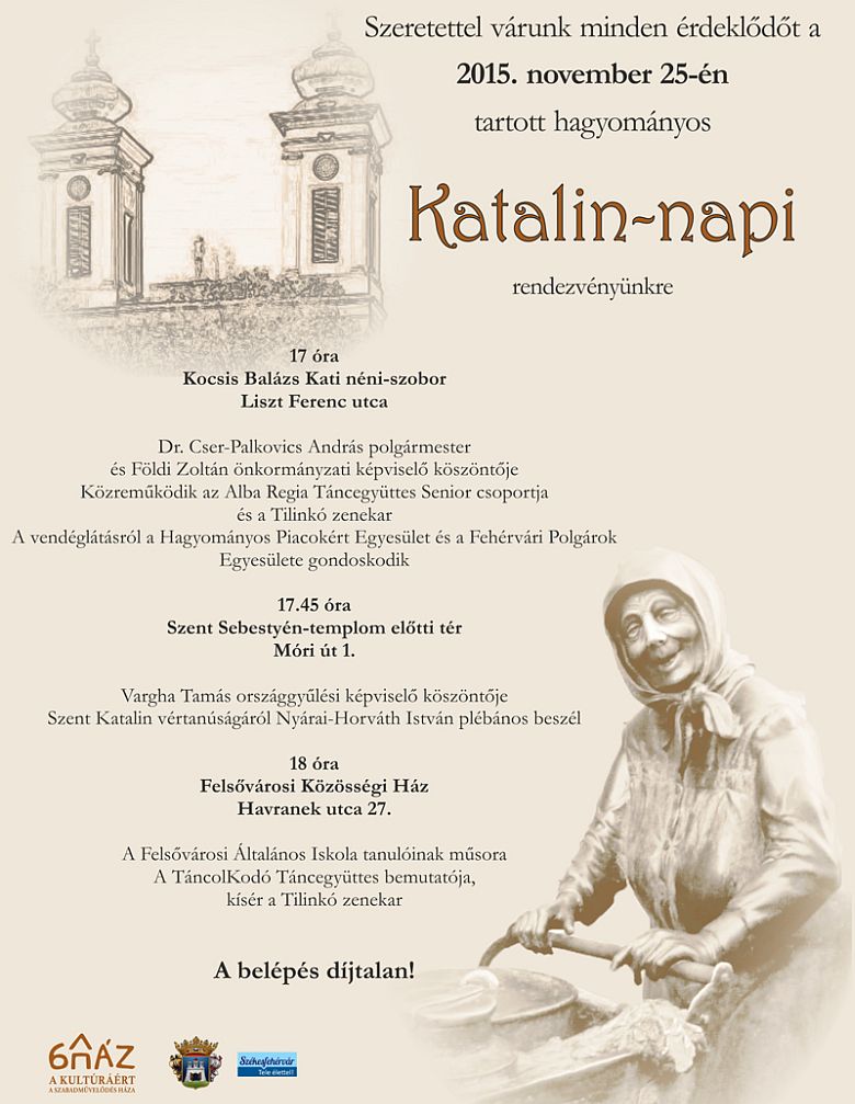 A hagyo- mányokhoz hűen újra megrendezik a Katalin-napi ünnepség- sorozatot Székes- fehérváron. A szervezők remélik, hogy ismét sokan eljönnek a programokra, melyek november 25-én, szerdán 17.00 órakor Kati néni szobránál kezdődnek, a Szent Sebestyén templomnál folytatódnak, majd este batyubálon mulatozhatnak a vendégek a Felsővárosi Közösségi Házban.