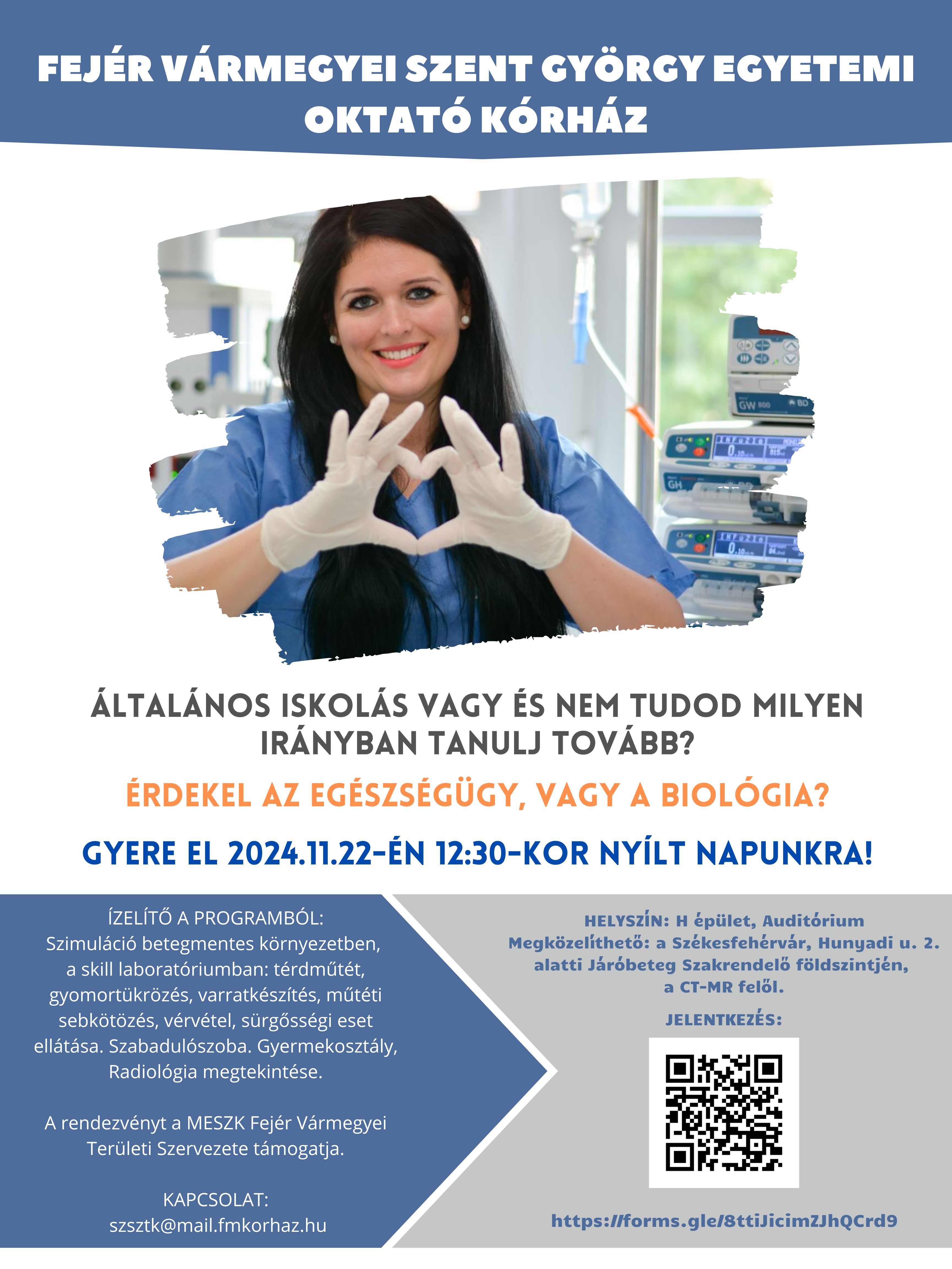Ismét nyílt napot szerveznek a Fejér Vármegyei Szent György Egyetemi Oktató Kórházban. November 22-én várják majd az általános iskolás diákokat, akik megismerhetik Magyarország legnagyobb vidéki kórházának mindennapi működését. A nyílt napra november 15-ig lehet jelentkezni.