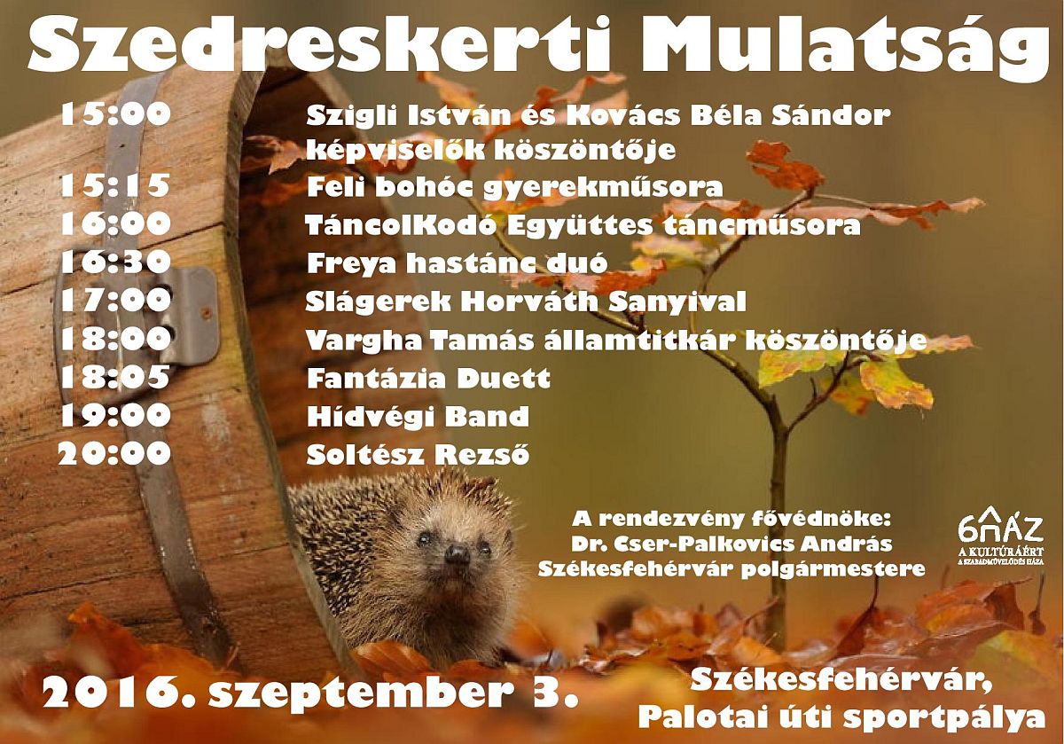 A szombati IV. Szedreskerti Mulatság részletes programját Kiss Dorottya, A Szabadművelődés Háza igazgatója ismertette. Mint mondta, a programok délután 15.00 órától egészen este 21.30 óráig tartanak. 15.00 órakor Szigli István és Kovács Béla Sándor önkormányzati képviselők nyitják meg a Szedreskerti Mulatságot, ezt követően pedig Feli bohóc gyermekműsora csal mosolyt a legkisebbek arcára. Ezután a táncé és a zenéé lesz a főszerep: 16.00 órától a TáncolKodó Együttes produkcióját tekinthetik meg a résztvevők. 16.30 órától a Freya hastánc duó lép fel, majd 17.00 órától Horváth Sanyi örökzöld slágerekkel szórakoztatja a közönséget. 18.00 órakor Vargha Tamás honvédelmi államtitkár, Székesfehérvár országgyűlési képviselője köszönti a programon megjelenteket, majd ezután a Fantázia Duett operett és musical dalokkal várja a városrész lakóit. A kiváló hangulat a késő esti órákban is garantált lesz: előbb 19.00 órától a Hídvégi Band húzza a talpalávalót mulatós nótákkal, majd 20.00 órától a rendezvény sztárfellépője, Soltész Rezső gondoskodik a jó hangulatról. A szervezők mindenkit szeretettel várnak!