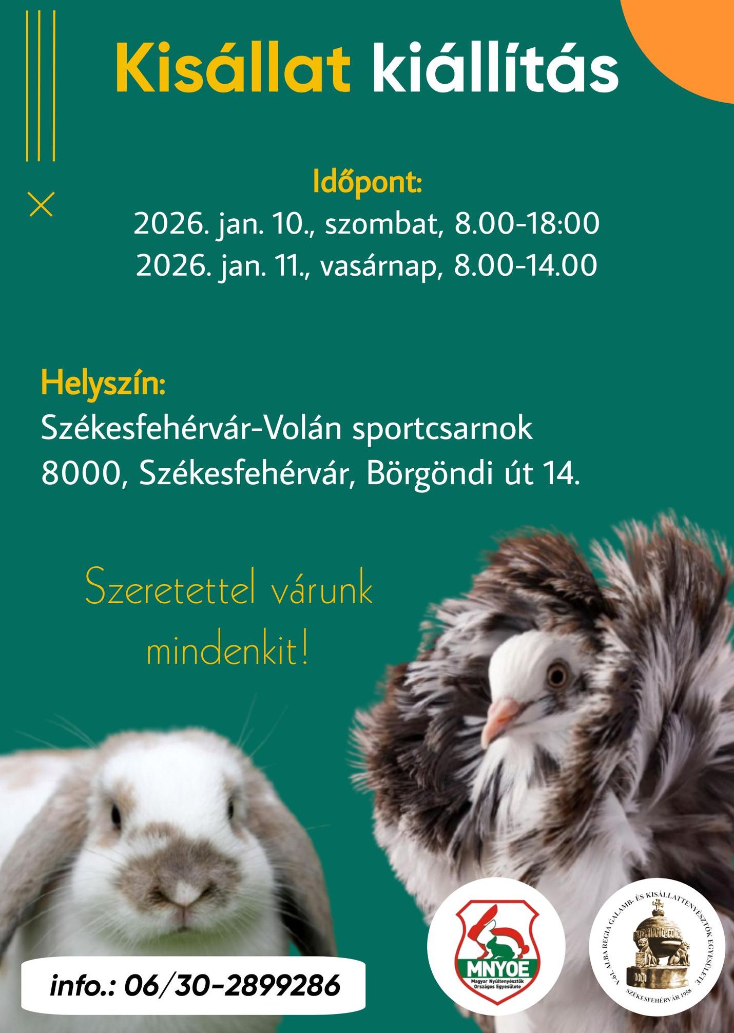 Az Alba Regia Galamb és Kisállattenyésztő Egyesület 2026. január 10-én és 11-én ismét megrendezi a hagyományos galamb és kisállat kiállítást, amelyen kisállatok több száz példánya lesz látható. A Volán Sportcsarnokban (Börgöndi út 14, Alba Volán központi telephely) felállított kiállítási ketrecekben galambokat, baromfit, nyulakat és sokfajta díszmadarat láthatnak az érdeklődők.