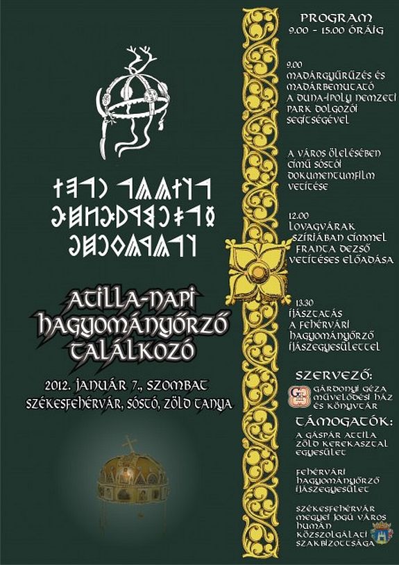 Január 7-én, szombaton délelőttől kora délutánig Attila-napi Hagyományőrző Találkozóra várják az érdeklődőket a Sóstói Természetvédelmi Területen a Zöld tanyán. Reggel kilenc órától madárgyűrűzés és madárbemutató lesz a Duna-Ipoly Nemzeti Park dolgozói segítségével, kora délutántól pedig íjásztatást tart a Fehérvári Hagyományőrző Íjászegyesület.