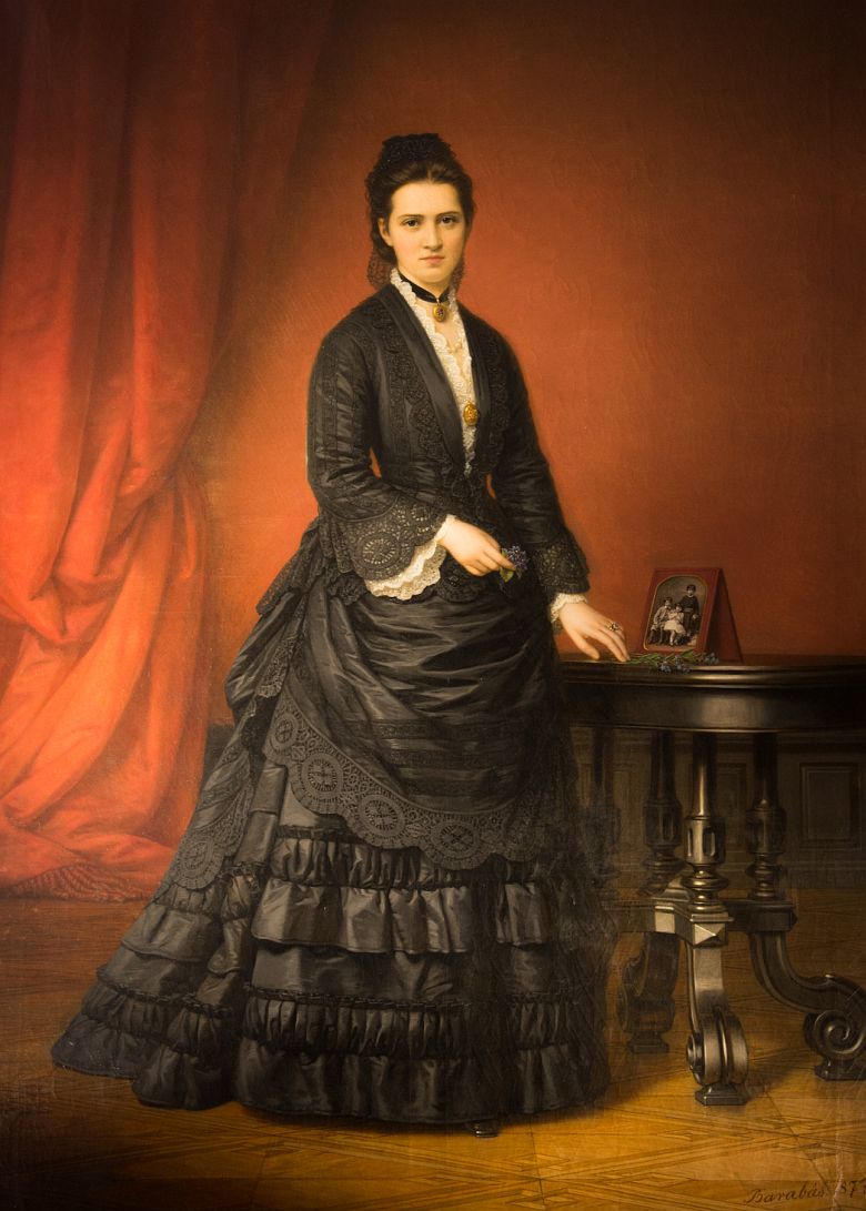 Barabás Miklós (1810 – 1898) életművében fontos szerepet töltöttek be a főúri és polgári megrendelésre készült egyéni és társas portrék, közülük való gróf Nádasdy Ferencné, született gróf Zichy Ilona (1849 – 1873) megörökítése. A gyászruhát viselő fiatalasszonyt ábrázoló egészalakos festmény, ahogy a jelzete mutatja, a grófné korai halála után négy évvel, 1877-ben készült. A kép előtörténete csak részben ismert, az azonban szinte bizonyos, hogy szorosan kötődik gróf Zichy Ilona férjéhez, nádasdi gróf Nádasdy Ferenchez (1842 – 1907), és általa a nádasdladányi, Tudor-stílusban épült Nádasdy-kastélyhoz, amelyet az özvegyen maradt, fiatal Nádasdy gróf úgy fejezett be és úgy rendezett be, mintha elhunyt hitvese továbbra ő is ott élne. A gróf többet nem házasodott meg, három gyermekének, a kultúrának és a közügyeknek szentelte életét.