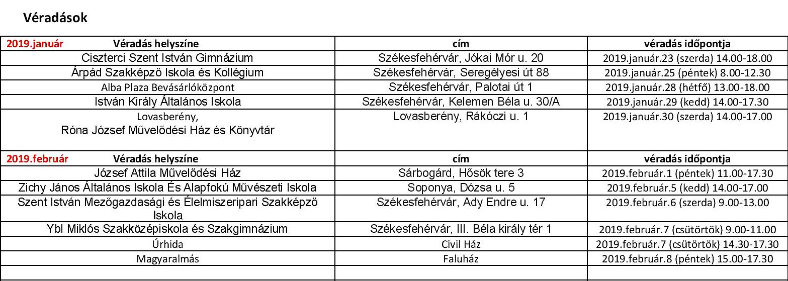 A társadalmi felelősségvállalás jegyében januárban és februárban is lehetőség lesz több székesfehérvári és Fejér megyei helyszínen vért adni.