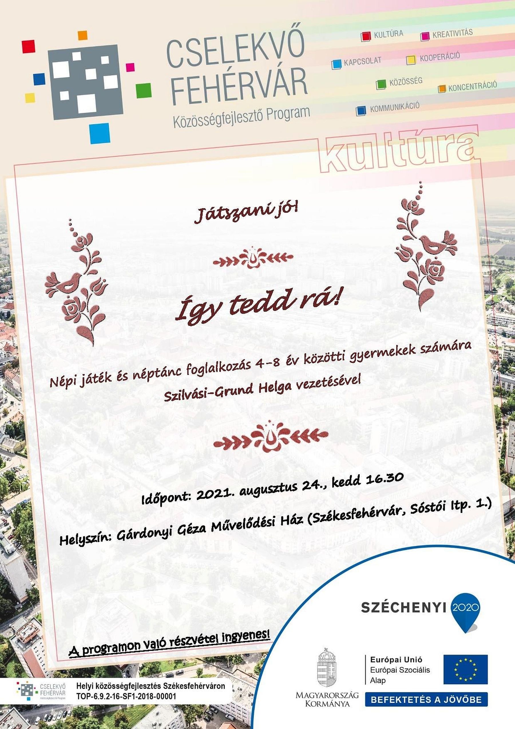 Az ingyenes programok a Tematikus programsorozatok, klubfoglalkozások szervezése Székesfehérváron a TOP-6.9.2-16-SF1-2018-001 projekt részeként valósulnak meg. A programokról a www.facebook.com/cselekvofehervar oldalon lehet tájékozódni.