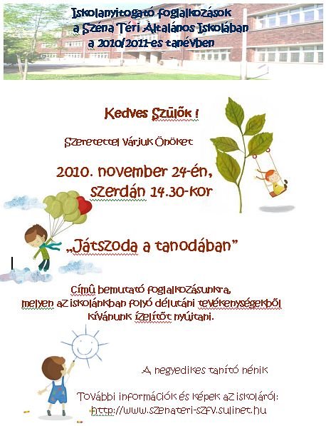 Iskolanyitogató foglalkozásra várják a negyedikes tanító nénik a nagycsoportos óvodások szüleiket a Széna Téri Általános Iskolában. A tájékozódni kívánó szülők a "Játszoda a tanodában" című bemutató foglalkozáson bepillantást nyerhetnek az iskolában folyó délutáni programokba.