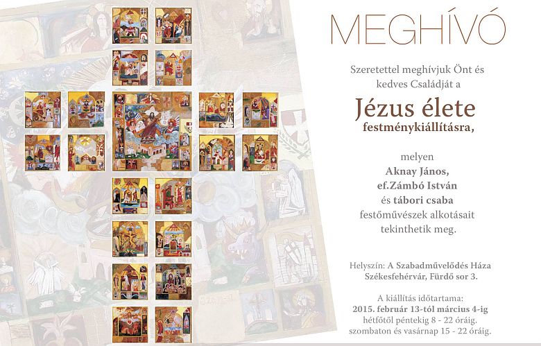 A Szabad- művelődés Házában március 5-ig látható a Jézus élete című, Aknay János, ef. Zámbó István és Tábori Csaba festményeiből álló kiállítás, a tárlathoz irodalmi, versmondó és rajzpályázat is kapcsolódik. Február 28-án, 14 órától versmondó versenyt tartanak a 20. századi, illetve a kortárs magyar költők istenes verseiből.