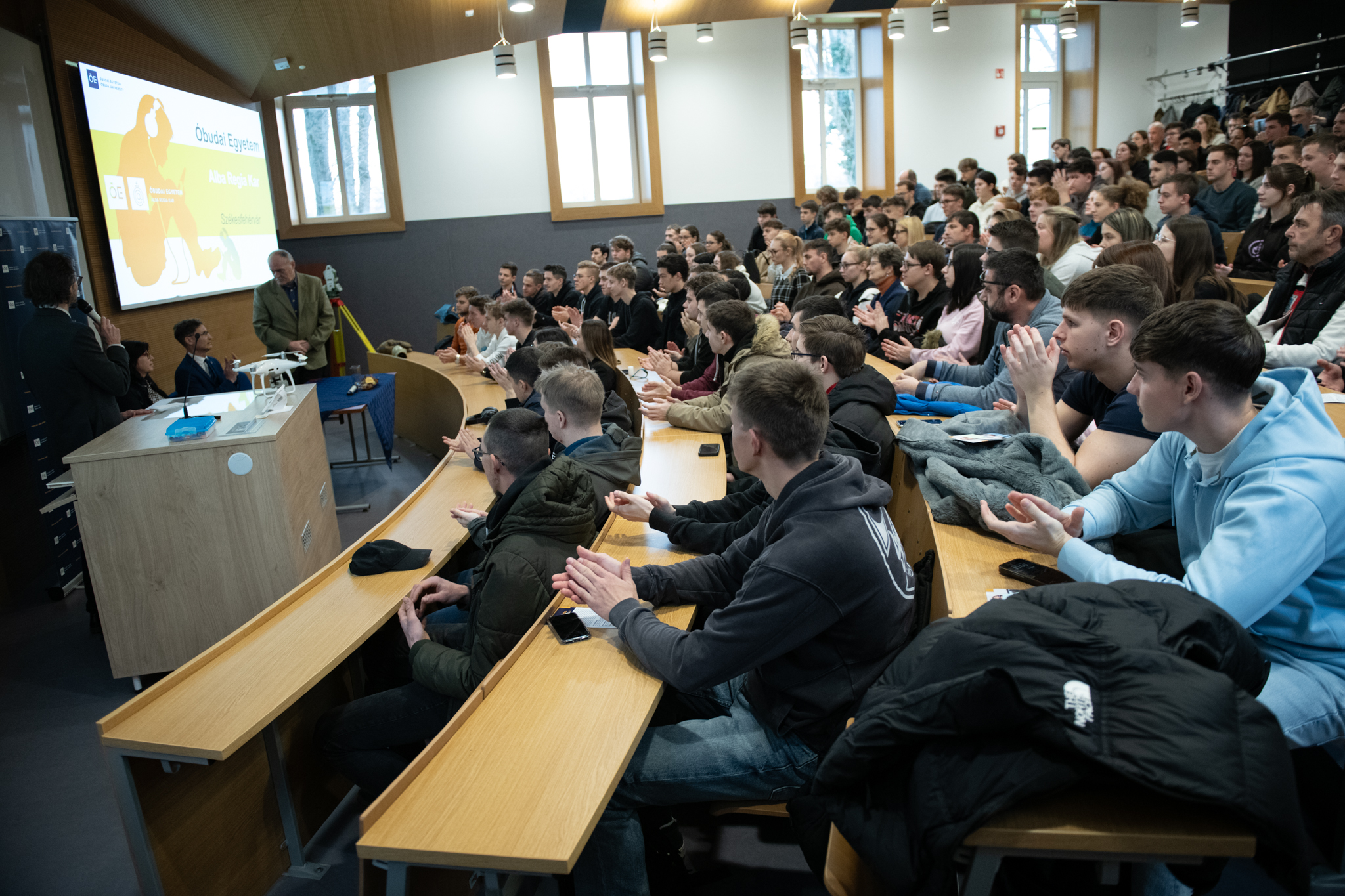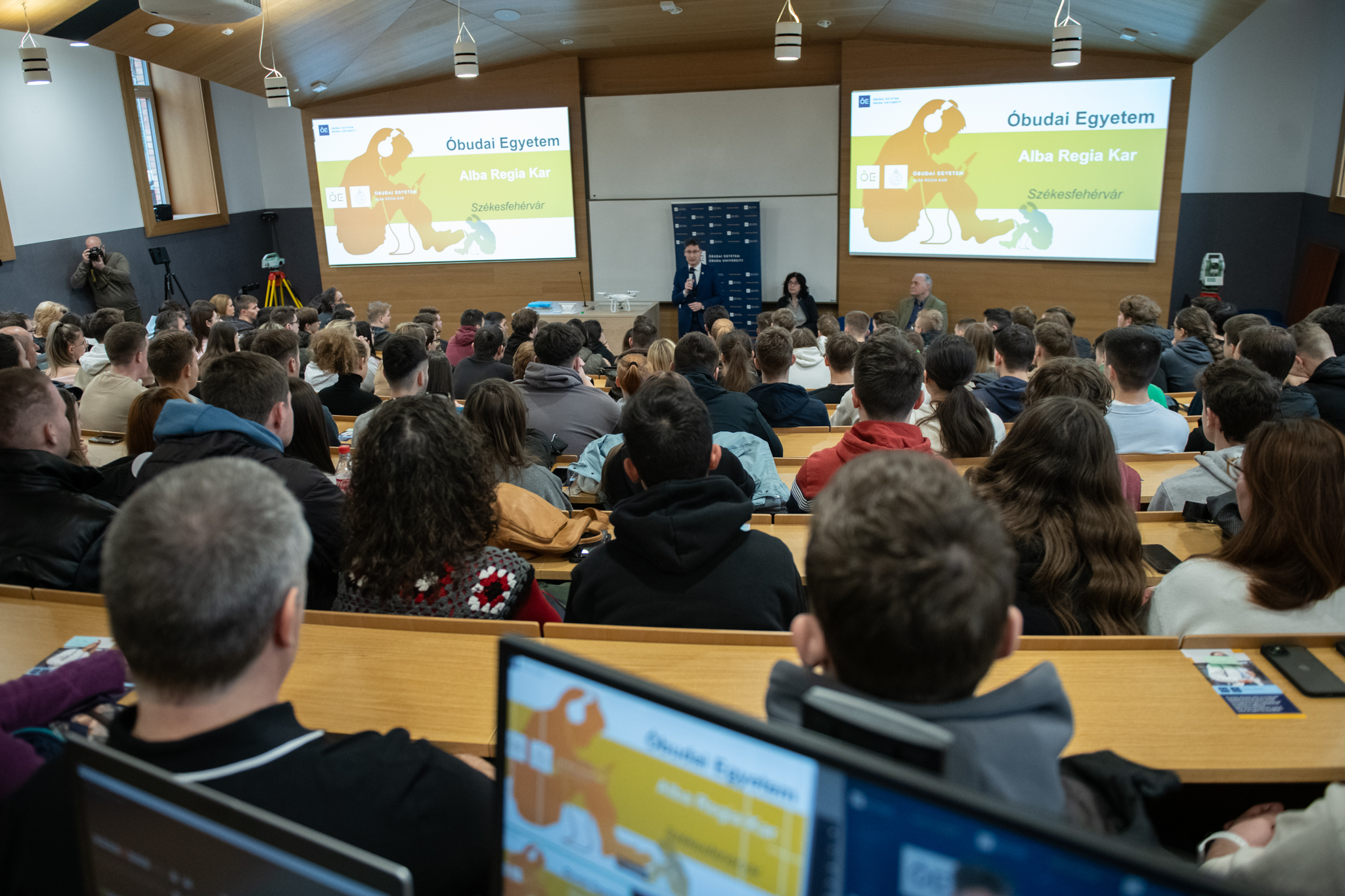 A pénteki nyílt napon olyan nagy volt az érdeklődés az Óbudai Egyetem Alba Regia Karának képzései iránt, hogy a zsúfolásig megtelt nagyelőadó mellett az egyetem különböző termeiben, online formában követték a megnyitót és az azt követő előadásokat a fiatalok.