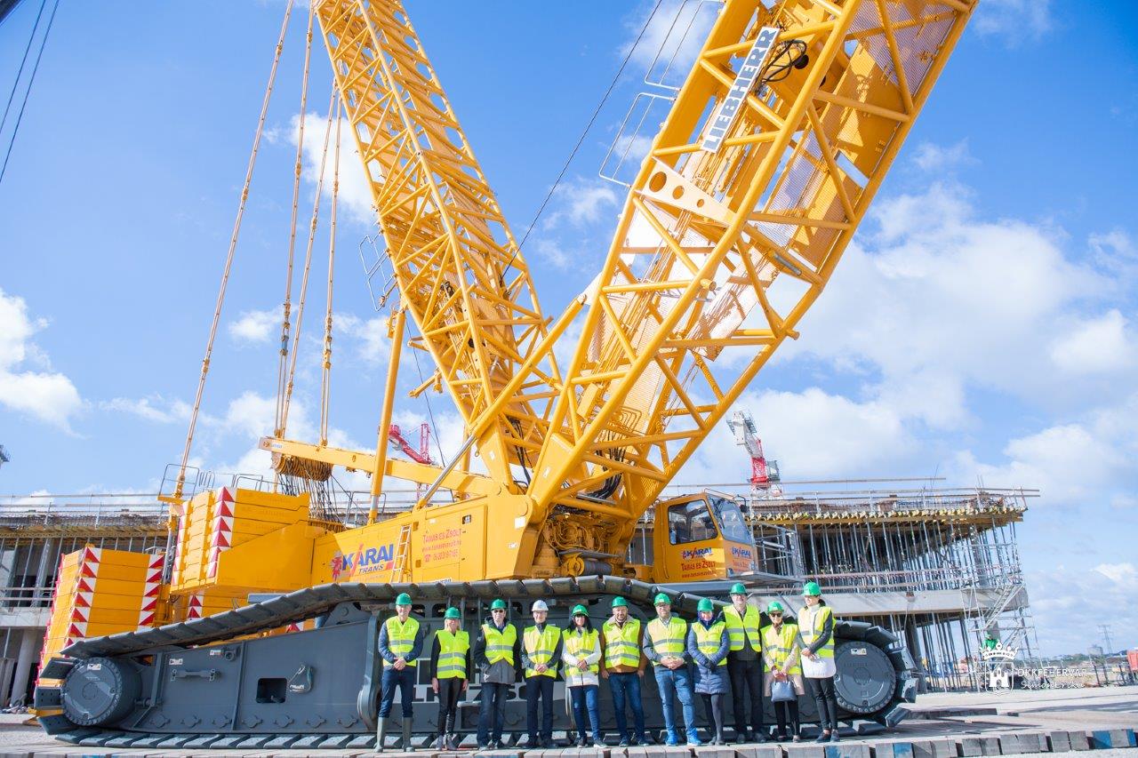 Az épület mellett már várják, hogy helyükre kerüljenek azok a rácsos tartók, amelyek áthidalják az arénateret. Ezekből a 60 tonnás szerkezetekből egy elemet már a helyére is emeltek egy speciális daruval, tudtuk meg. A 750 tonna teherbírású lánctalpas daru maga is különleges: a hosszúgémje 91 méter magas, maga a gép 8 tonna súlyú és mintegy 25 kamion szállította a helyszínre, ahol egy héten át szerelték össze – mondta el Bajnok Sándor, a Market Építő Zrt. műszaki igazgatója. A szerkezetépítés 95 százalékos készültségben áll. A következő fázis nekünk egy mérföldkő: 2023 júliusa. Ekkorra kell kompletten elkészülnie a tetőfedésnek, szigetelésnek és a homlokzati üvegportáloknak is.
