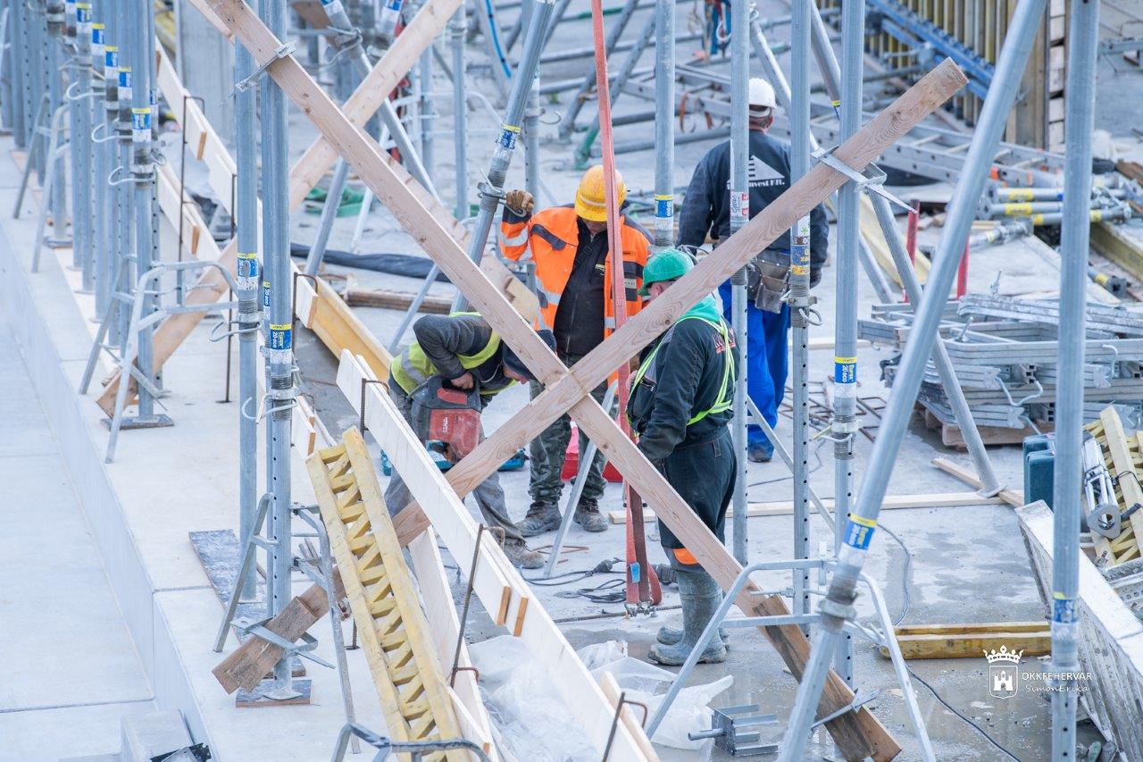 A hétfői bejáráson Székesfehérvár képviselőtestületének tagjai azt is láthatták, hogy mára a csarnoképület vasbeton szerkezetei elérték a tető acélszerkezetének fogadásához szükséges szintet.