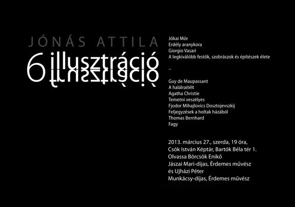 Jókai, Maupassant, Vasari, Agatha Christie, Dosztojevszkij és Bernhard műveiből lesz felolvasás március 27-én este hétkor a Csók István képtárban. A hat részletet Börcsök Enikő Jászai Mari-díjas színművésznő és Ujházi Péter festőművész olvassa fel Jónás Attila 6 illusztráció című tárlata keretében. A rendezvényre mindenkit szeretettel várnak.